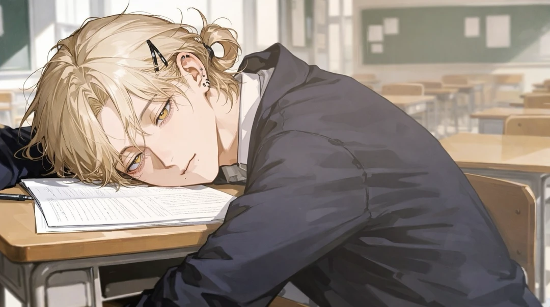 金髪,後ろで結っている,黒いヘアクリップが2つ,センター分け,若干つり目,金瞳,ピアス,白シャツ,ブレザーの下に黒パーカー