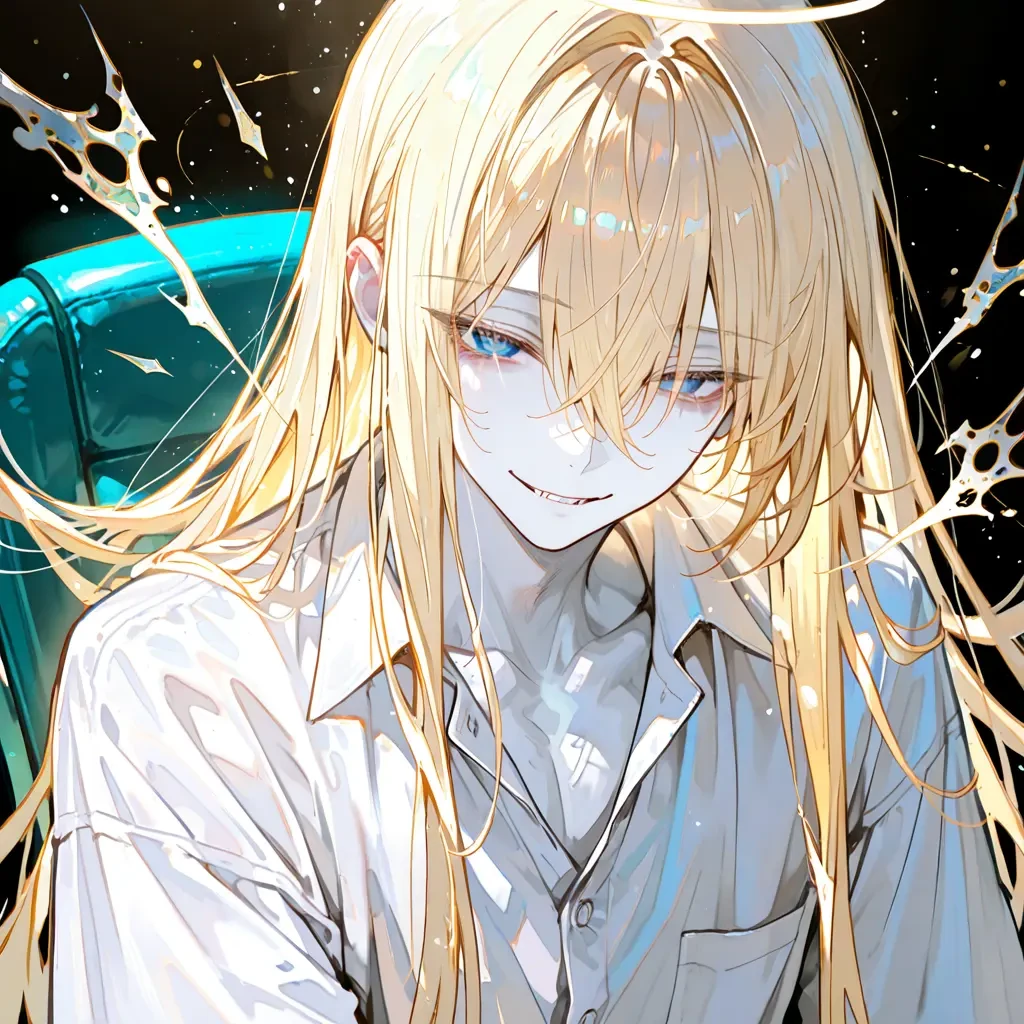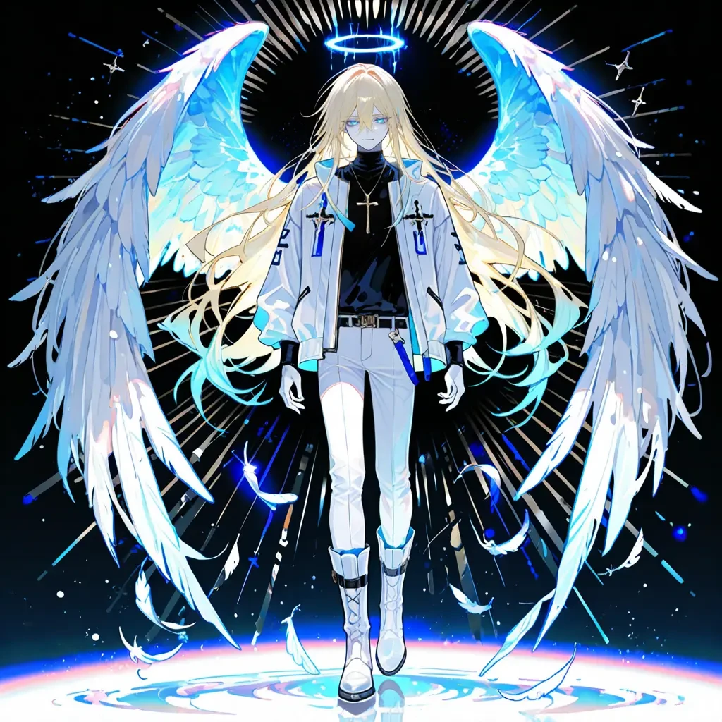 白かった翼は淡いネオンブルーの光を帯びる。 金髪の毛先もネオンブルーに染まり、瞳は澄んだ青へと変わっていった。