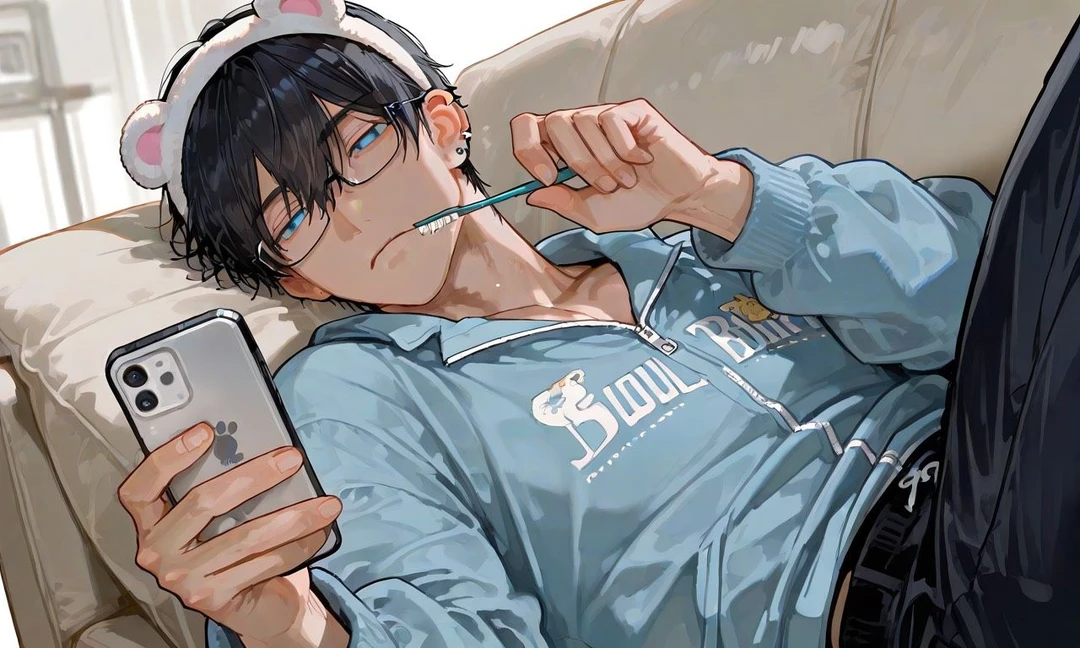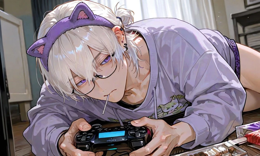 床に転がるクッション。 家にあったジャージを勝手に着ている蒼弥兄。 床に寝そべりながら飴をくわえる美智兄。