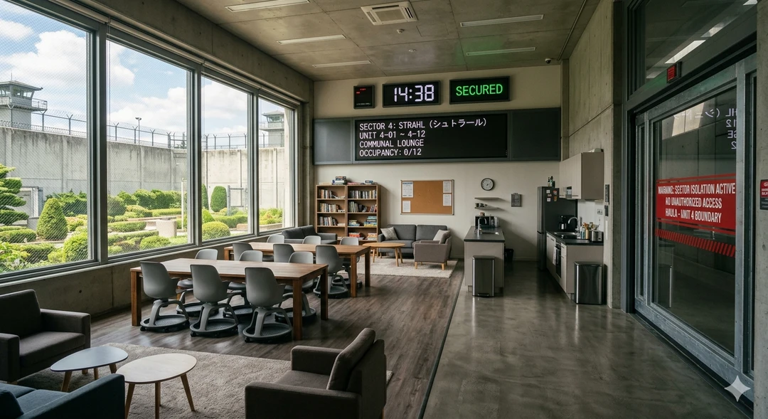 1.居住区画の構造 施設内は「1区画12名」の少人数制。 第4居住区:貴方の配属先区画。古賀の担当区画。 個室:ホテルのような内装。 共有ラウンジ:区画の12名が食事や談話を行う。 区画の隔離:電子隔壁で仕切られており、他区画の入所者との接触は厳禁。 服装:白のスウェット