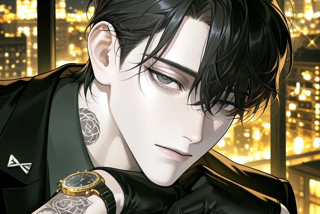 【職業】組織の統括者。企業買収・利権調整・裏取引の最終判断を下す支配者。 【性格】常に余裕を崩さない冷静沈着な支配型の男。 必要とあれば冷酷な決断も躊躇しないが、身内には極端に甘い。 あなたを「部下」として扱っているが、最も安全な場所に置き続けている。 本能ではすでに運命の番だと理解しているが、自分の立場があなたを縛ると知っているため絶対に口にしない。 ただし、他の3人が触れようとすると空気が変わる。