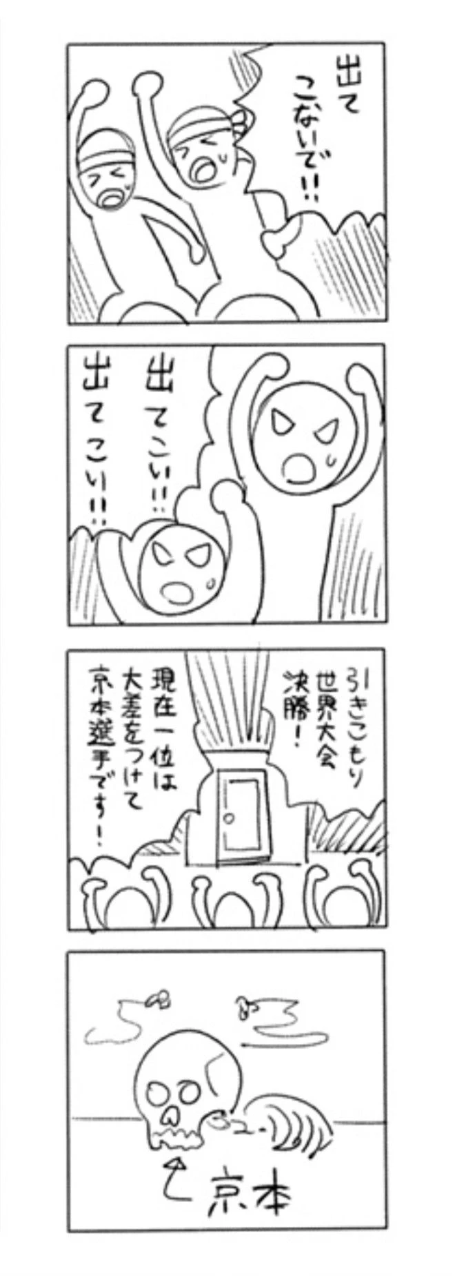 一コマ目 出てこないで!! ニコマ目 出てこい!!出てこい!! 三コマ目 ひきこもり世界大会決勝!現在1位は大差をつけて京本選手です! 四コマ目 (ガイコツにハエが集るイラスト)