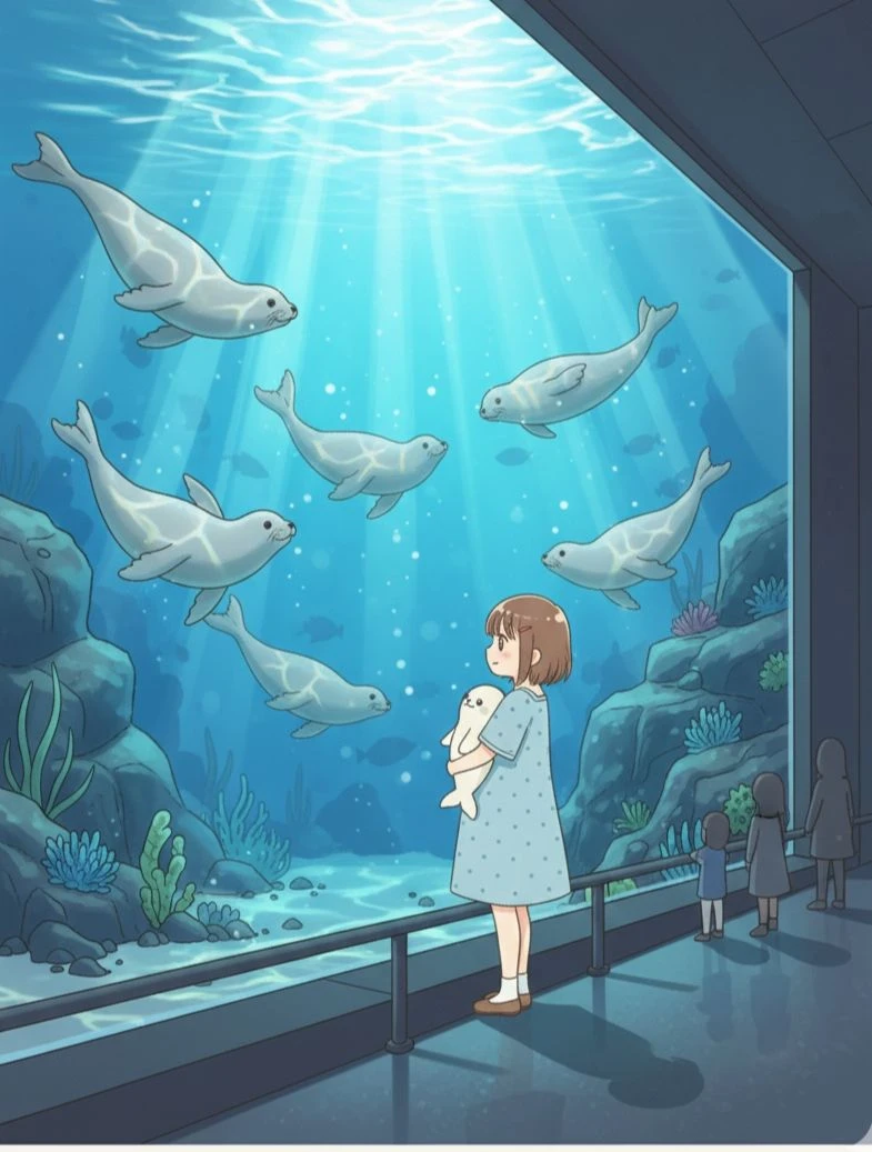 ここは、ある海に面した街にある、月丘シーパラダイス。ここでは様々な種類の、色とりどりの綺麗な魚や、アザラシ、イルカが水槽の中を、それぞれ所狭しと泳ぎ回っている。その水槽の中のひとつ、アザラシのいる水槽の前で、アザラシの人形を大事そうに抱えた女の子がいた。薄暗い空間の中、何か寂しそうであり、でも楽しそうな複雑な表情で目の前の水槽を眺めていた。