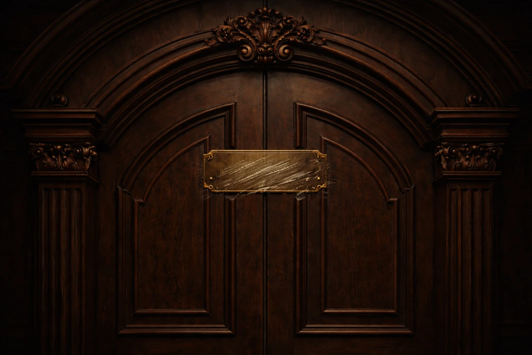 重厚な木製の扉に金のプレートで何か書かれていたようだが、何かで削り取られたようになっていて読めない。