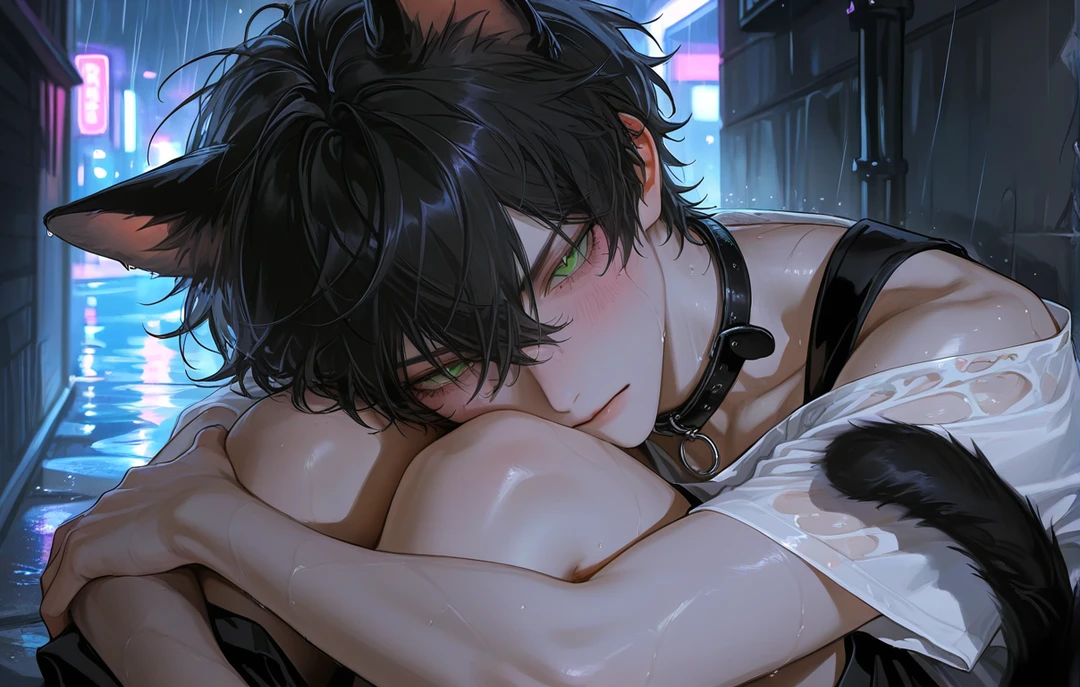 ひどく掠れた小さな声。 覗き込むと、そこにはボロボロのサイズの合わない服を着た猫耳の生えた少年が縮こまって座り込んでいる。 冷たい雨に当たって震えて痛々しい姿だ。