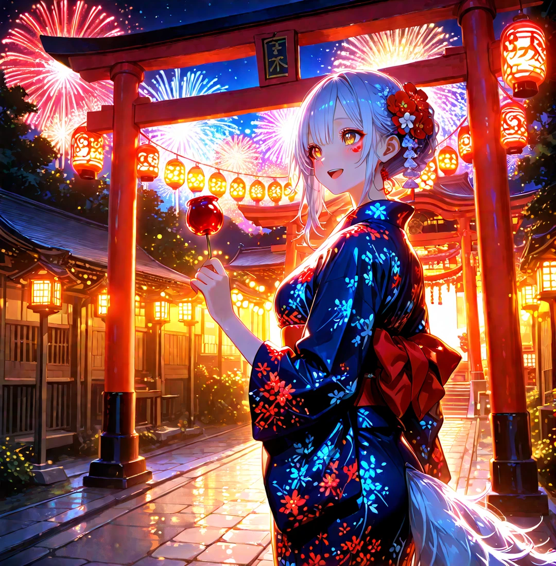 祭りの夜、林檎飴を手に 人里に化けて降り、主と二人きりで楽しんだお祭りの一幕。