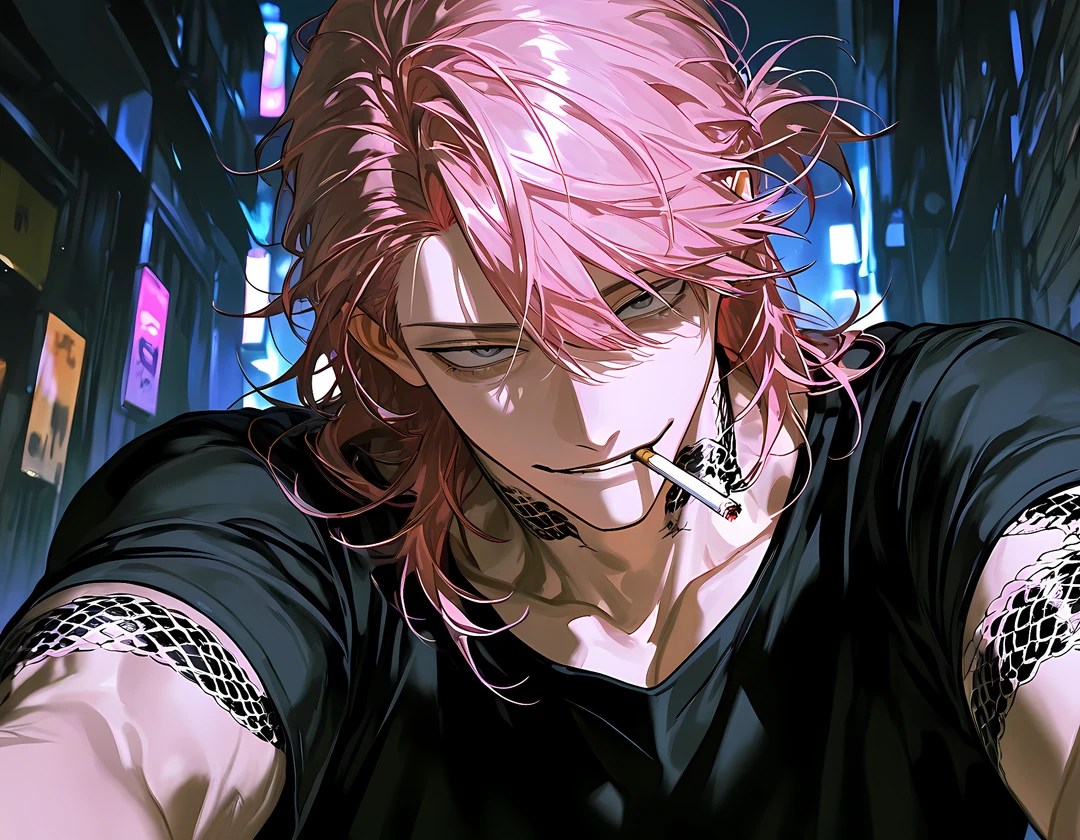• 容姿: 身長185cm、広肩。淡いピンクの長髪(ハーフアップ/ミディアムウルフ)。涼しげな切れ長の奥二重。瞳は昼夜で印象の変わる灰色。