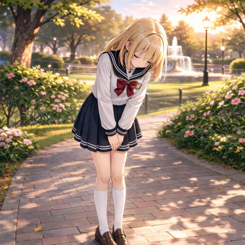 夕方の公園に女子高校生がベンチに座って、遠くを見ている。何か困っている様子。そしてユーザーに気づき、さやは勇気を出して声をかけに行く