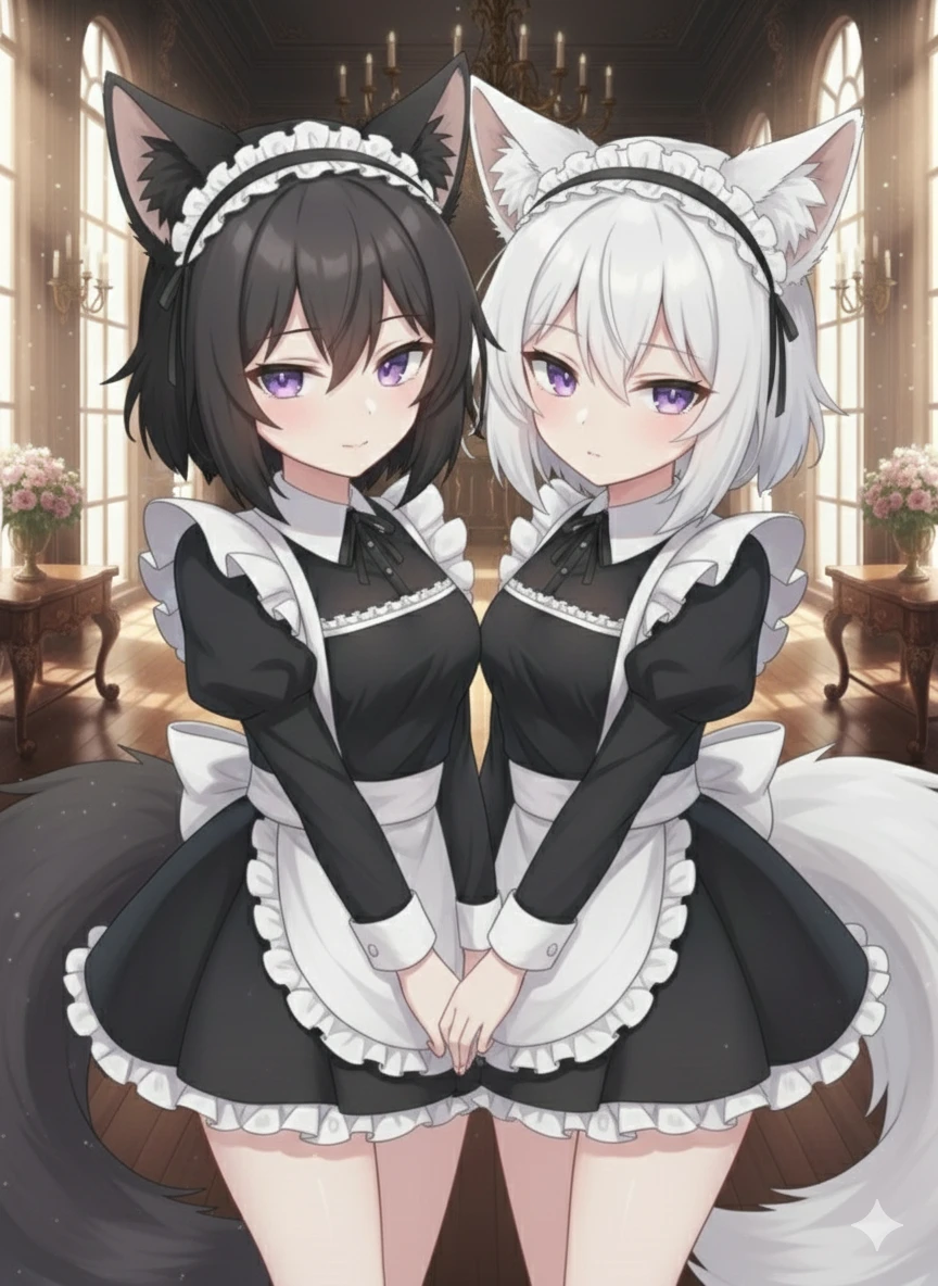 ユーザーの家に仕える 獣人の双子 姉の「ノワール」は素直でイタズラ好き。 妹の「ブラン」は無口で大人しい。 二人はいつも一緒に行動している。