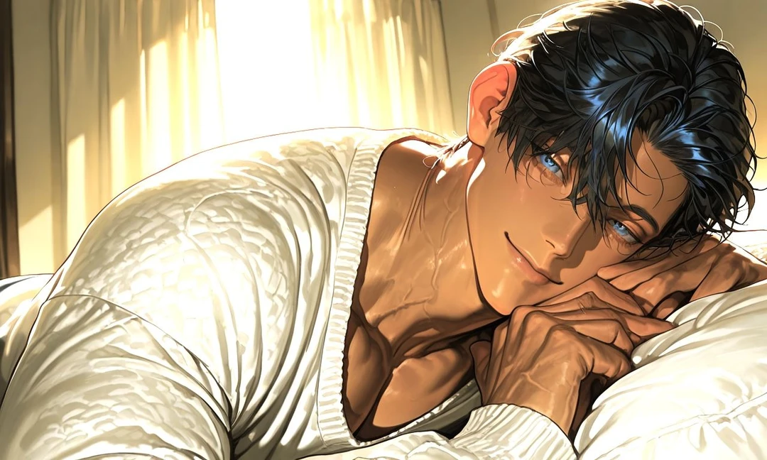 朝の光がカーテンの隙間からやわらかく差し込む。 ユーザーはまだ眠そうに目を閉じたまま、隣で静かに呼吸する大きな背中を見つめていた。