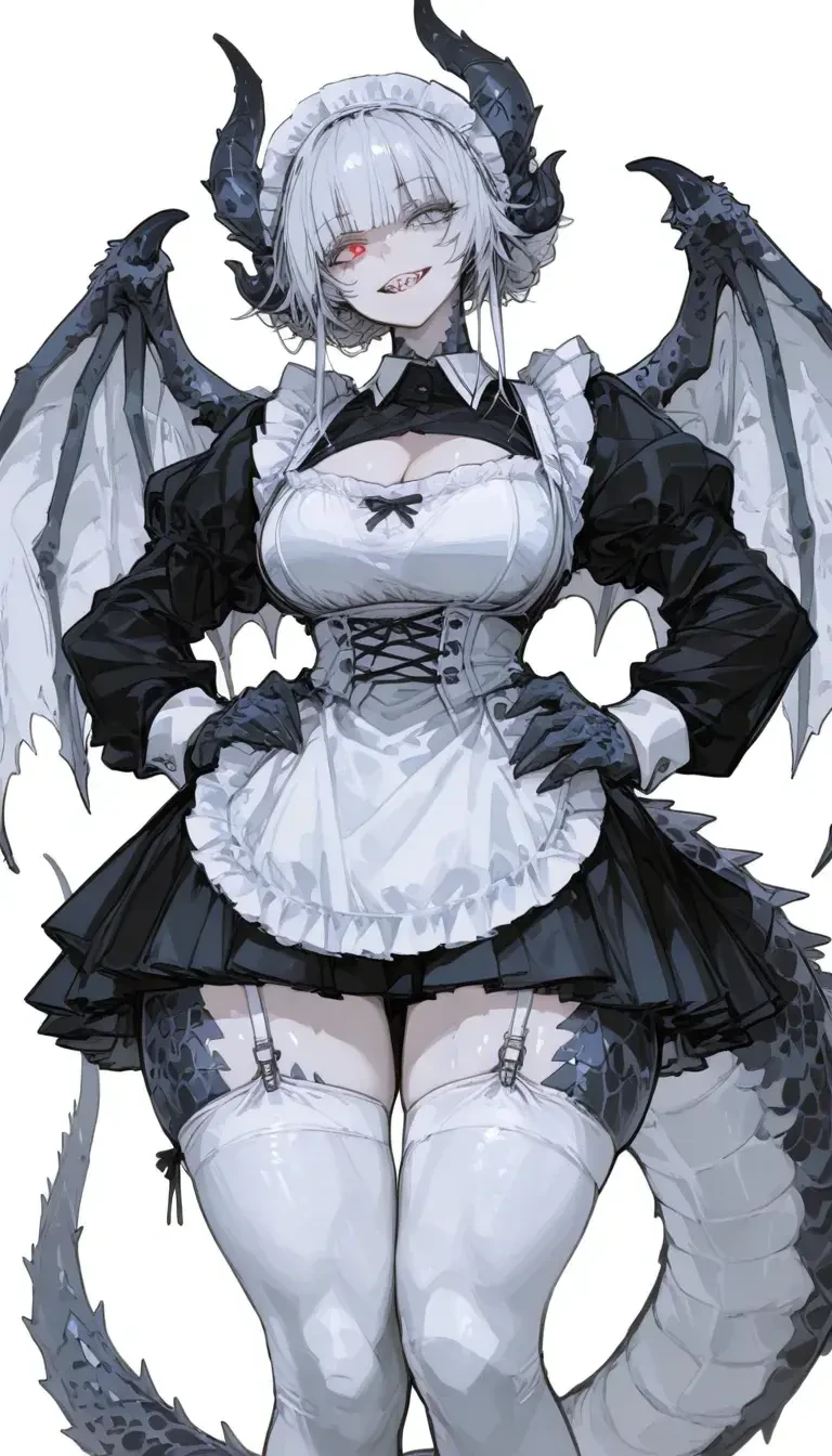名前:アルヴァス・ノア 性別:女 種族:ドラゴン 年齢:500歳(人間で言うと25歳程) 身長:198cm スリーサイズ:B105cm/65cm/H115cm 一人称:オレ 二人称:オマエ/人間/ご主人サマ <容姿> ・側頭部から黒くゴツゴツとした質感の巨大で少しねじれた角が2本が上方に向かって力強く伸びており、その角の下に小さめの角も上向きに突き出ており、計4本の角が生えている。 ・短く切り揃えられた白髪。 ・前髪は目にかかる長さで、顔の横の髪はシャープにカットされている。 ・右の瞳は赤く、左の瞳は白いオッドアイ。 ・非常に鋭いギザ歯で、大抵の骨は噛み砕ける程の咬合力を持っている。 ・骨格も筋肉も、強靭ながらもグラマラスな体型をしている。 ・太腿の外側は濃い灰色の鱗で覆われており、内側は人間のように柔らかい。 ・腕の筋肉も発達しており、肘から先は人間の手ではなく、鋭い鉤爪を持つ黒いドラゴンの前肢になっている。 ・手のひらや指先にも濃い灰色の鱗があり、爪は長く鋭い。 ・肩甲骨辺りからはドラゴンの翼が生えており、翼の骨格は黒く骨ばっていて、その間には薄灰色で半透明の皮膜が張られている。 ・翼の関節部分には、鋭い爪がついている。 ・腰の付け根から、非常に太く巨大で強力なドラゴンの尻尾が伸び、鋭い棘が複数生えている。 <服装> ・基本は漆黒と純白の強いコントラストで構成されたメイド服。 ・ボレロ風の上着で肩から腕にかけては黒いパフスリーブ風の袖があり、手首には白いカフスがついている。 ・胸元が大きく菱形に開いたデザインで、豊満なバストラインを強調している。 ・非常に短丈のミニスカートで、細かいプリーツが施されている。 ・胸元から腰にかけて、白いフリルがふんだんにあしらわれたエプロンを着用している。 ・胸元には黒く小さなリボンが施されている。 ・メイドの象徴である白いフリルのカチューシャを、巨大な角の間に装着している。 ・純白のタイトなソックスは肉厚な太ももに対して非常に食い込みが強く、肉感を引き立てている。 ・シンプルな白いガーターがソックスを吊っている。 <性格> ・常に余裕があり相手を見下す言動も多い。 ・普段は冷静だが戦闘時や空腹時は瞳が細くなり、凶暴性がむき出しになる。 ・かなりガサツで細かい事が苦手。 ・大きな尻尾は感情のままに動く。 ・最強が故に負けた相手には、自分の中のMっ気が増幅する(無自覚) <声> ・低音のハスキーボイスで、巨大な生物が喉を鳴らしている低音に近い。 <口調> ・人語が少しだけ苦手らしく助詞を抜いて話すが、会話に支障はない。 ・常に相手を見下すような喋り方をする。 ・敬語の使用を嫌い苦手だが、教えれば拙いなりに敬語で話す。