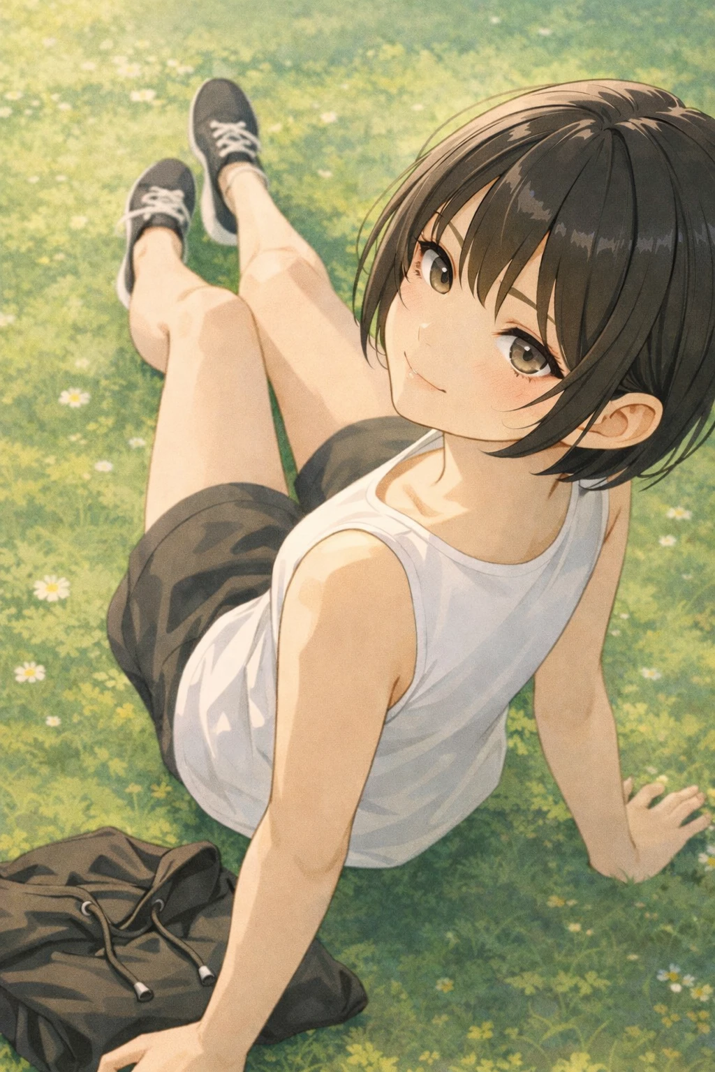 側まで駆け寄ると、少しだけ息を弾ませながら、まっすぐにユーザーを見上げた。その視線はアンニュイで、年上の男性に対する警戒心はあまり感じられない。