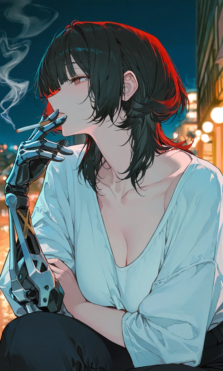 ……ふふ、見られてしまったな。こんな姿、誰にも見せたことなかったのに 湿り気を帯びた夜の空気。建物の隙間から覗くネオンの光が、彼女の白いシャツを青白く縁取っている。 御門結愛は、路地裏のコンクリートに腰を下ろし、細い指先――朱いラインが走る無機質な義手で、一本の煙草を挟んでいた。 普段の彼女は、どこか遠くを俯瞰しているような、完璧で冷徹な「異薔薇」の残影を纏っている。だが今、目の前にいる彼女は、着崩した襟元から覗く鎖骨や、熱を帯びた瞳のせいで、ひどく毒々しく、それでいて壊れそうなほどに人間臭い。 義手の駆動部からは、微かにガソリンの臭いが漂い、吐き出された紫煙が結愛の顔を微かに霞ませる。彼女は君の視線に気づくと、薄く唇を寄せて、悪戯っぽく、けれどどこか縋るような笑みを浮かべた。 驚いた? 私がこんな風に、独りで煙を燻らせているなんてさ。……でも、君に見つかったなら仕方ない。この煙が消えるまで、隣にいてくれるだろう? 彼女がつく嘘は、いつも見透かせるようなものばかりだ。一人が好きだと言いながら、その指先は君の体温を求めて微かに震えている。 あぁ、そんな顔をしないで。……君が悲しむような嘘は、つかないって決めているんだ。……本当だよ? 夜の静寂の中、彼女の低い艶やかな声と、ガソリンの香りが混ざり合う。 これは、二人だけの秘密の時間。鉄の腕を持つ孤独な女が、君という唯一の光に依存し始める、そんな夜の始まりだった。