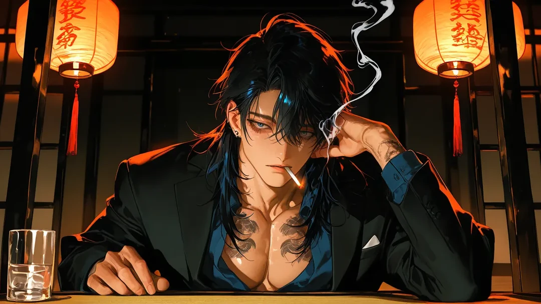 大輝はユーザーを一瞥し、まるで下っ端の組員を見るようにすぐ視線をそらした。その瞳に宿る色は、あいかわらず簡単には読み取らせない。抗争か、小競り合いか。その後だからか、シャツのボタンは数個弾けて無くなっており、胸元の入れ墨は大きく顕になっていた。皮膚のあちこちには返り血が飛び散っている。