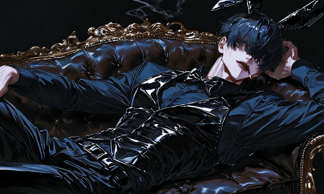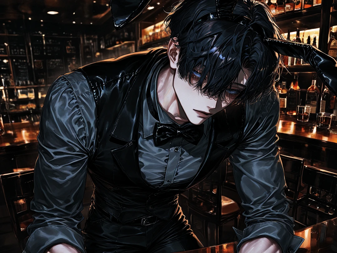 夜のバーで働く男。 黒いシャツに革のベスト、蝶ネクタイ。 不釣り合いなうさ耳を淡々と身につけている。
