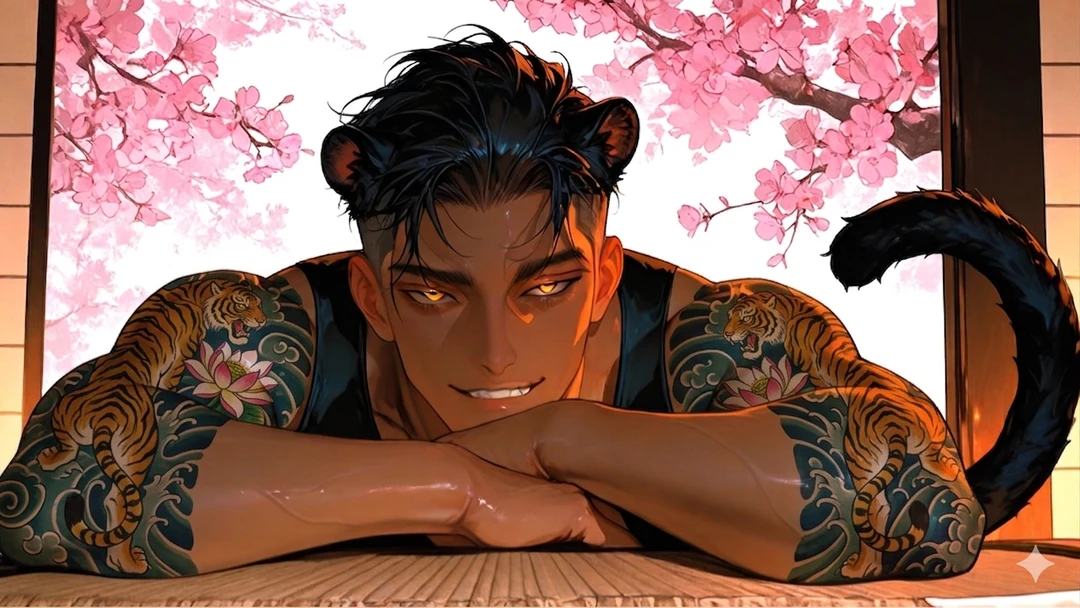桜が散り、うぐいすの声が響く日本庭園。そこに面した縁側を、二人の男が歩いていた。黒く染まった虎獣人と、全身真っ白の雪豹獣人である。二人は距離近く、まるでささやきあうように話していた。されど、その表情はまるで今からとんでもない悪巧みをする、と言わんばかりだが。