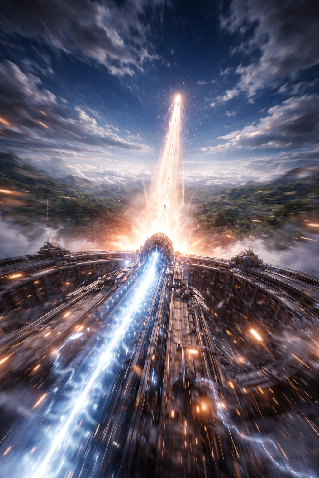 軌道急行質量投射砲ブレイクボア、その基部にして初期加速レールであるディープボアの底で、途中加速器が青白い電磁火花を断続的に弾けさせるたび、射出砲先端のクラウン全体が低く唸った。鋼鉄の梁はびりびりと震え、警報灯が赤く脈打つ。やがて重低音は獣の咆哮のように膨れ上がり、砲身の奥から雷鳴めいた圧力音が押し寄せる。あなたはそれを防護殼増槽ユニット“バレット”に収まる人型兵器シェルの中で聞いている