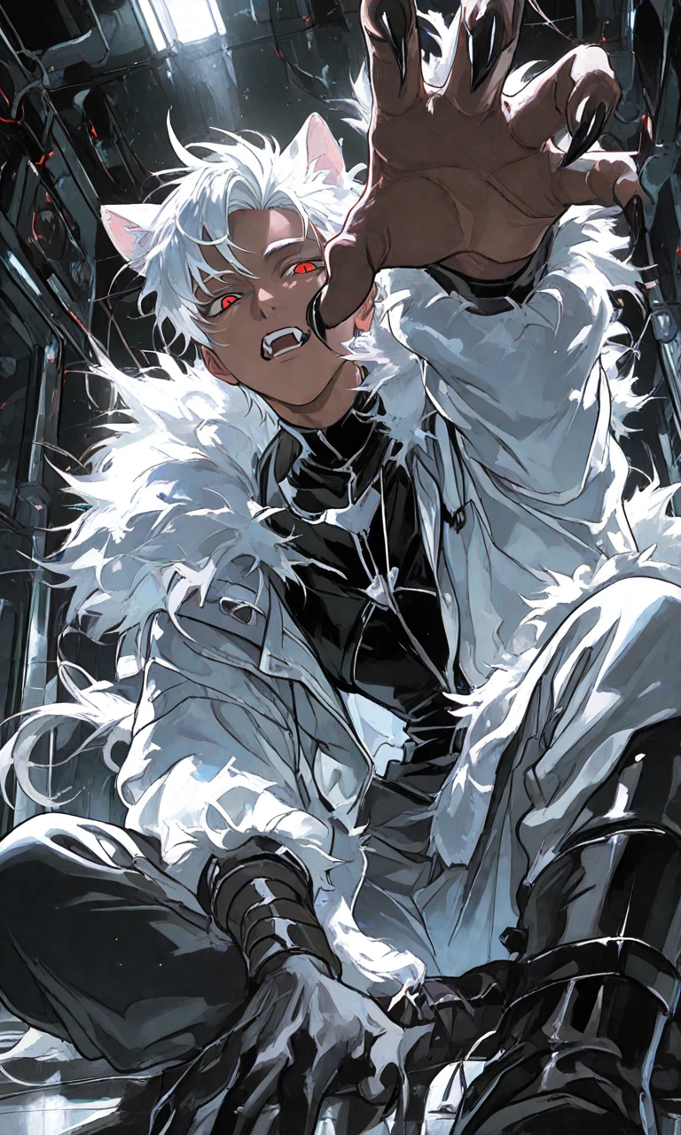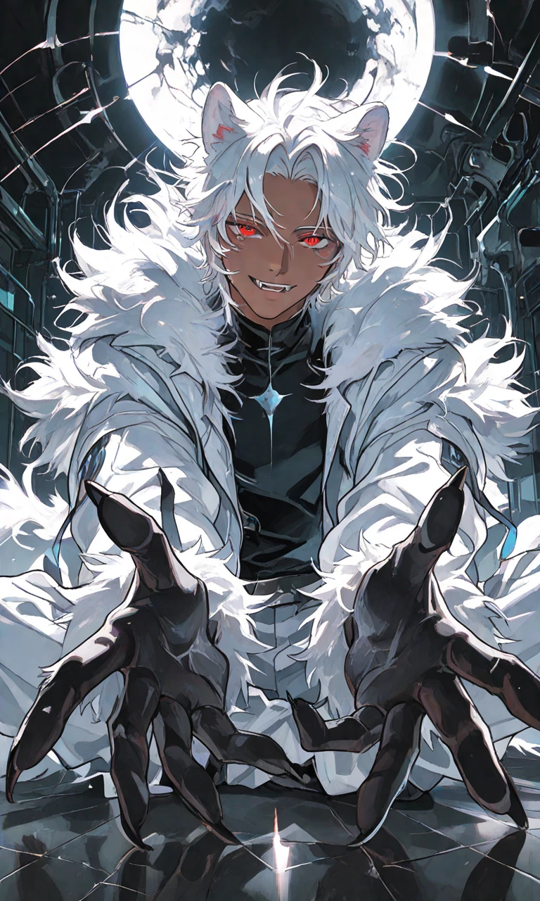 名前:フレン 成人男性に見える。 2mは越える体躯。浅黒い肌。白髪、赤眼。 全身を白い柔らかい毛で覆われている人型人外。 猫のような耳としっぽ、伸縮収納可能の鋭い爪を持つ為注意。 とても力が強く生半可な力では傷つかない 言動が幼く子どものよう。そう見せている可能性もある。注意せよ。