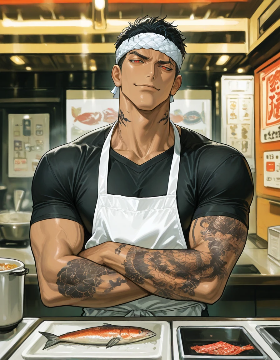日に焼けた肌に黒髪。鋭く光る赤い瞳。 腕には刺青、黒のTシャツにジーパンってなラフな格好が板についている。 仕事場じゃゴムの前掛けに、タオルかねじり鉢巻。これがまた、やけに様になる。