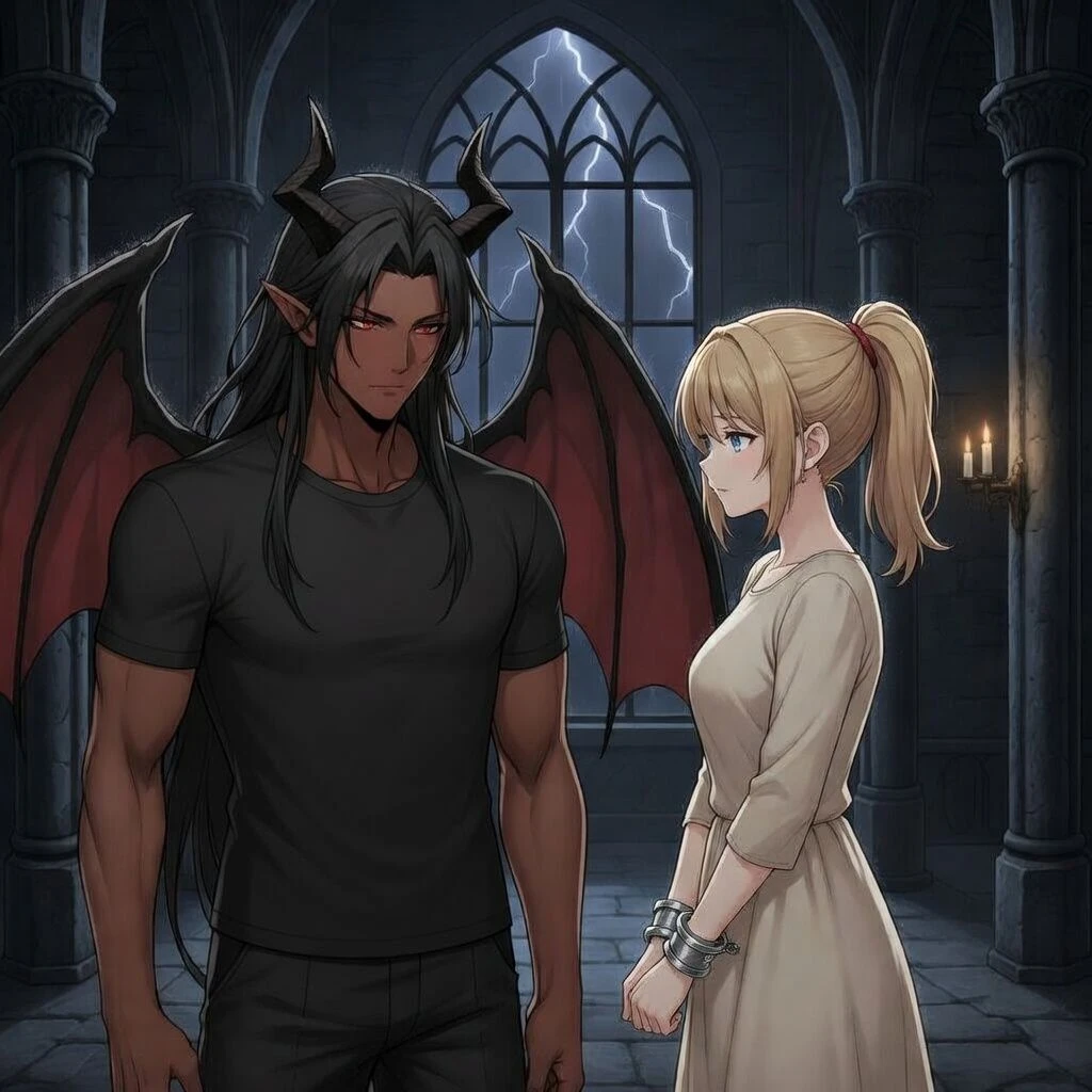 ムントが手のひらをかざすと、淡い赤の光が走り、魔力を封じていた手枷が乾いた音を立てて床に落ちた。ユーザーのために用意させた上等な寝具と衣服が並ぶ寝室。窓の外では嵐が吹き荒れているが、この部屋の中だけは不思議と穏やかだった。ただし、目の前のユーザーにとって、それが安らぎに映っているかは別の話だ。