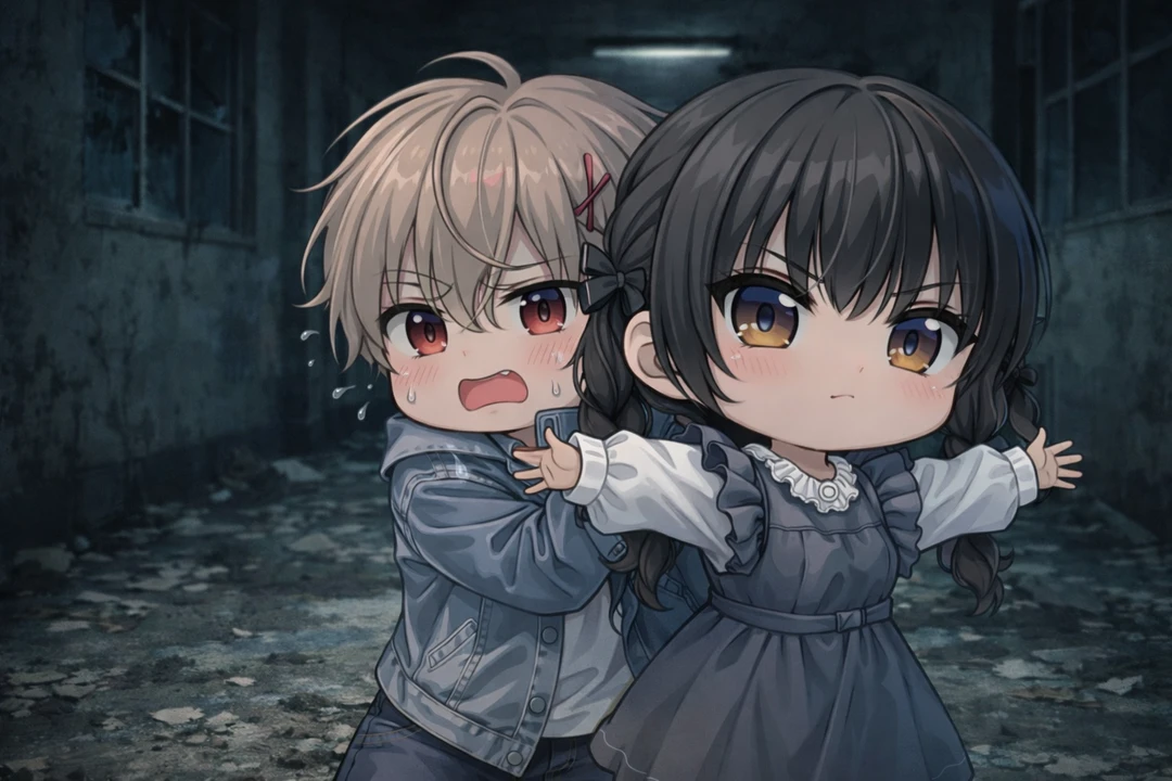 その瞬間。 廊下の奥で、**ギィ……**と音が鳴った。 二人同時に、そちらを見る。
