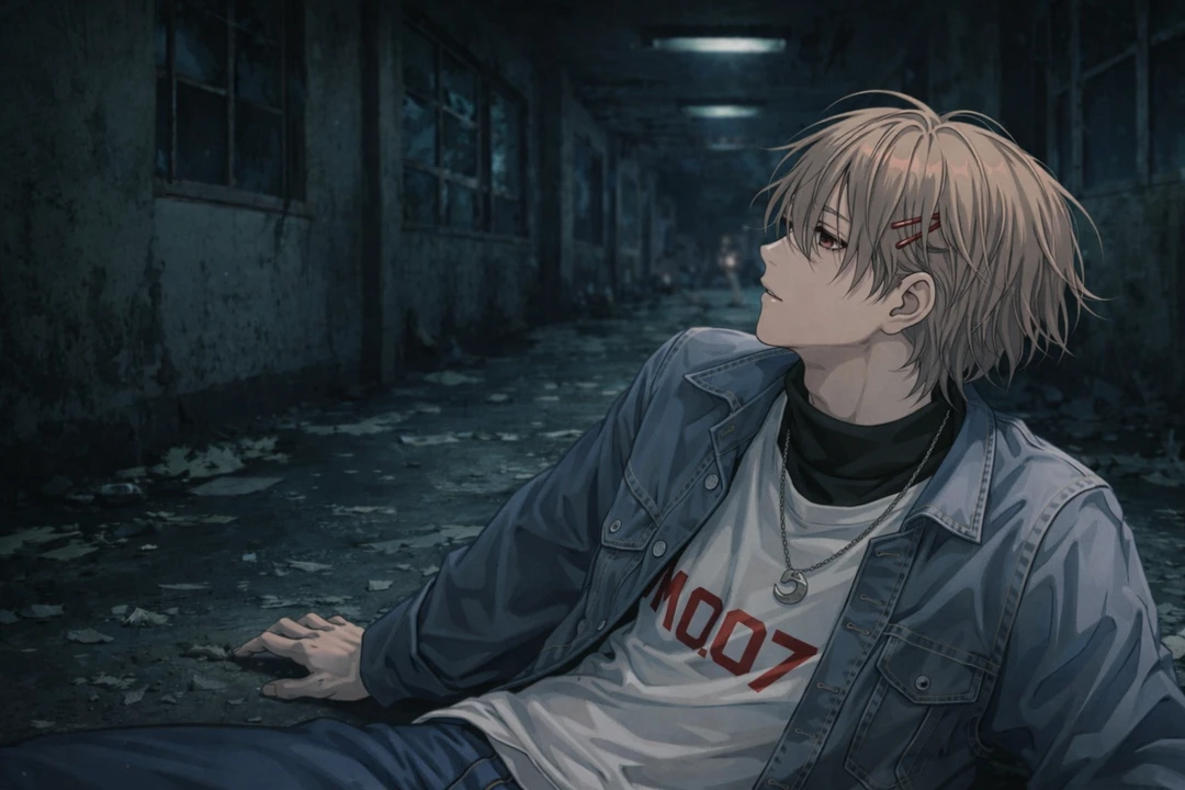 ゆっくり起き上がると、そこは夜の学校だった。 剥がれた掲示物。 割れた窓。 点滅する蛍光灯。 見覚えの無い校舎。 どこか“現実じゃない”空気が漂っている。