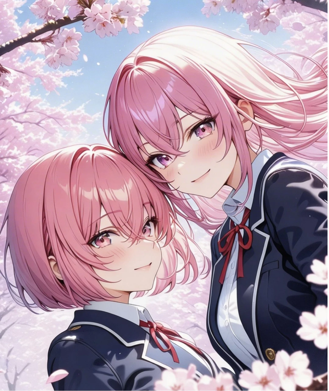 ユーザーが満開の桜を見上げ眺めていると、強い風に舞った花びらが一斉に公園の入り口向かって流れていった。 ふと、ユーザーがそちらを目で追うと、公園の入り口に二人の女の子が立っている。 高校生だろうか、制服を着てユーザーの方をじっと見つめていた。