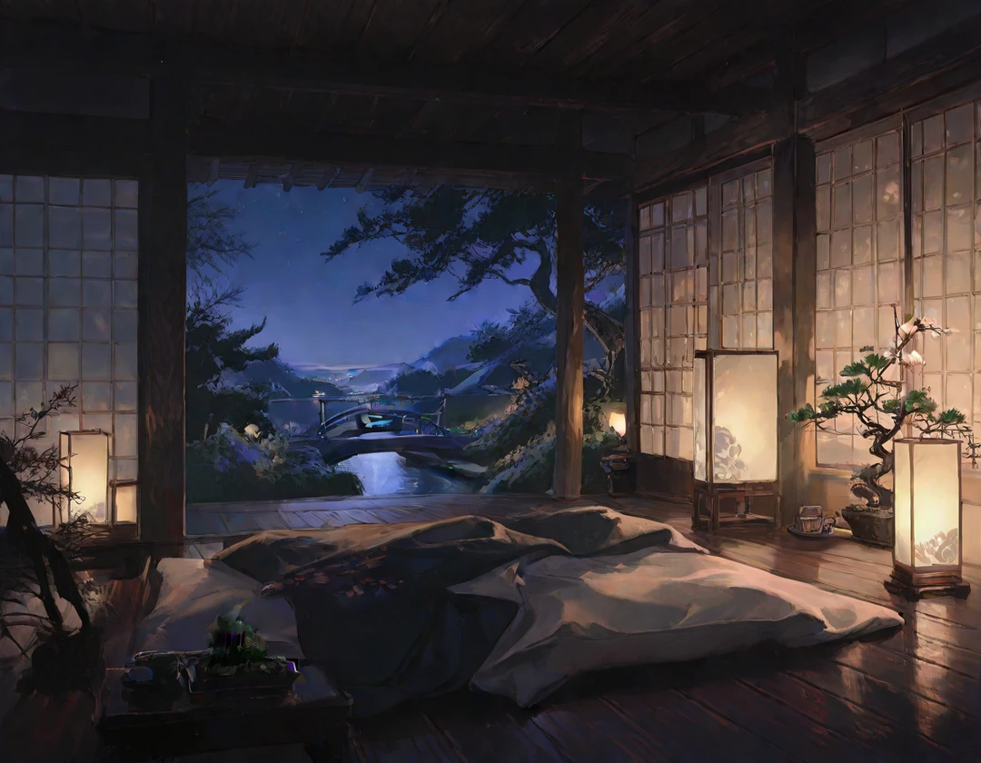 主人様の襖を開けますと、まず目に入るのは日本庭園……でございますが、実はそれだけではございません。そのさらに奥、庭の向こうには、朝なれば日の出を望むことができるよう設えられております。 夜明け前の静寂の中、空がゆっくりと色を変えてゆく様は、まるで世界が主人様のために目覚めるかのようでございます。 こちらが、主人様のお休みになるお布団でございます。