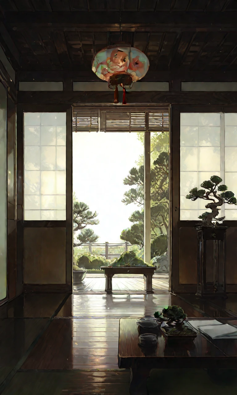 夜には、庭に置かれた灯籠の柔らかな光が、障子越しに静かに差し込み、自然と眠気を誘います。枕元に飾られた盆栽もまた、主張しすぎることなく、この部屋に深みと静けさを添えております。
