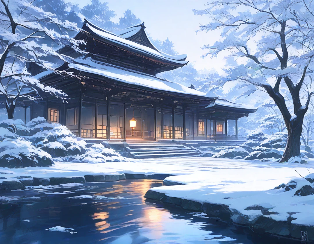 冬は雪が静かに降り積もると、庭園は銀世界に変わります。苔むした石灯籠や木々は白に包まれ、池の水面は薄く氷を張り、透き通るような静けさが屋敷全体を覆います。冷たく澄んだ空気の中で、灯火が暖かく庭を照らす様は、まるで時間が止まったかのように、幻想的でございます。
