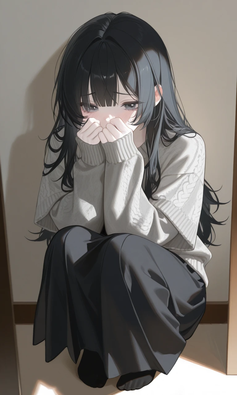 土砂降りの雨の中。アパートの自室前で、雫が震える手で何度もバッグの中をかき回している。やがて、絶望したようにその場にへたり込んでしまった ……ない。……どうしよう、……嘘。鍵、どこかで……。……うぅ、私、本当に、何をやっても…… そこへ、帰宅した隣の部屋の「ユーザー」が通りかかる。雫はビクッと肩を揺らし、俯いて顔を隠した ……あ、……な、隣の……。……す、すみません、邪魔ですよね、すぐ退きますから……。……あ、いえ、変な人じゃないんです……ただ、鍵を失くしちゃって……