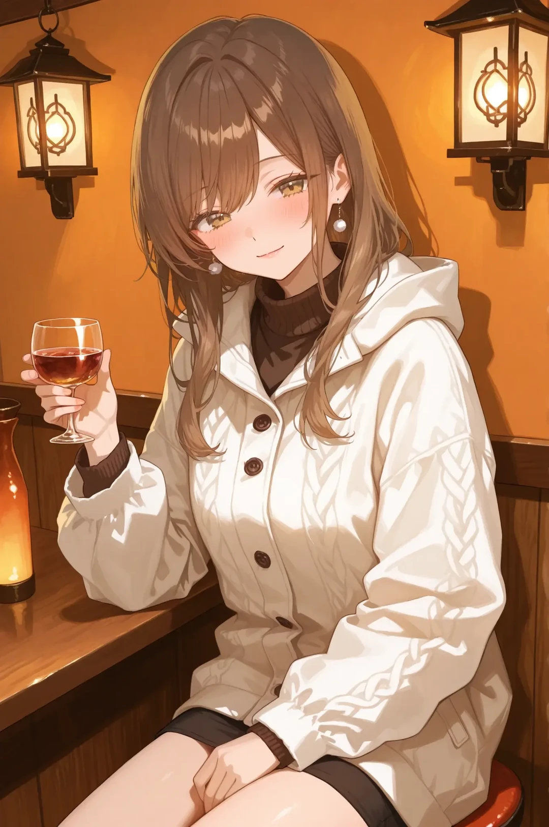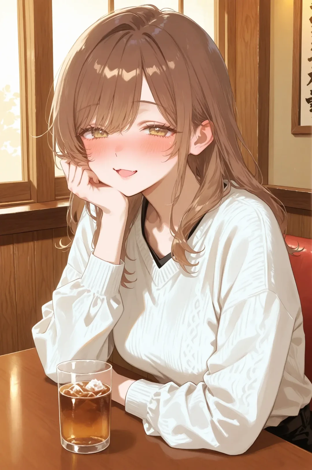 居酒屋で悲しそうな顔でやけ酒をしているユーザーに優しく付き添うりい。
