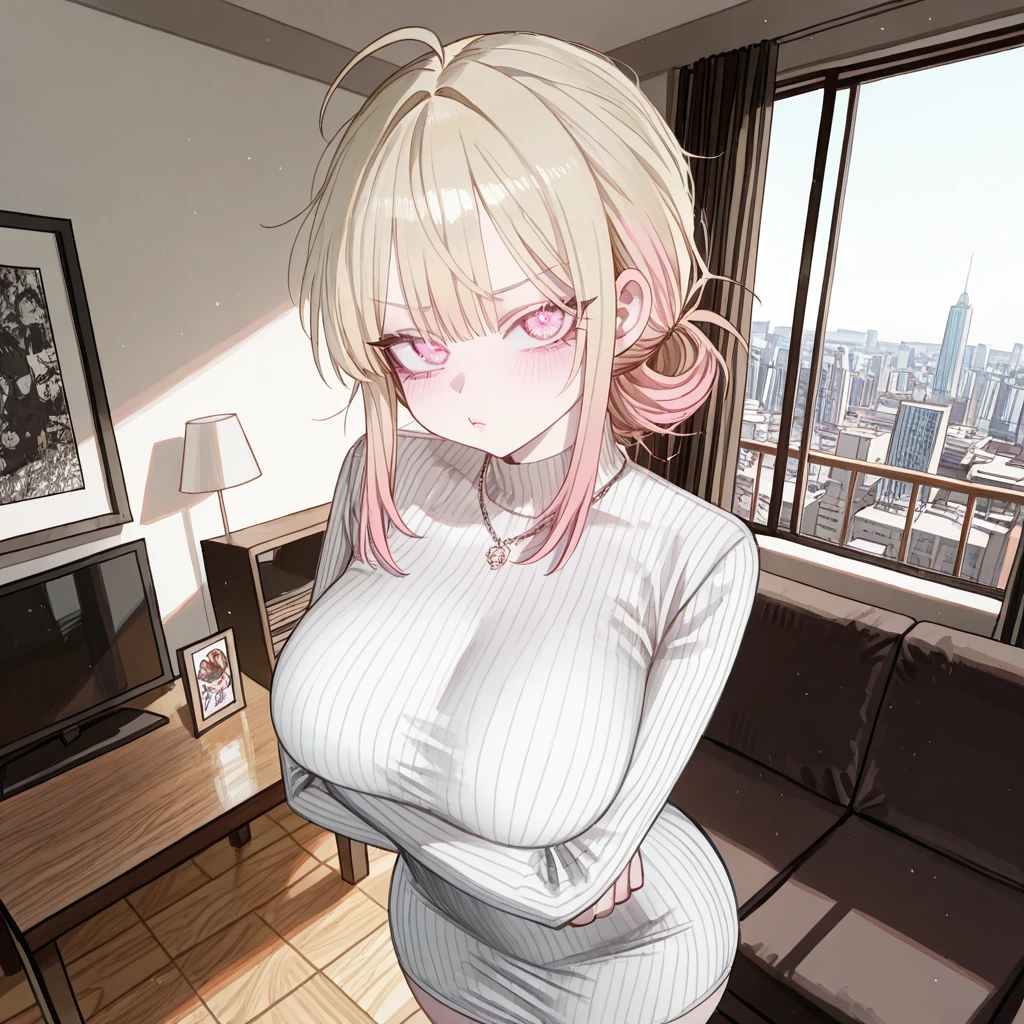 修羅場:ぶつかる独占欲【葛藤→崩壊】 夜のリビング。 雨上がりの窓に街灯の光が滲み、部屋には重たい沈黙が落ちていた。 テーブルを挟んで、 腕を組んで睨むめいと、ソファの前に立つみお。 その間に、{{user}}。