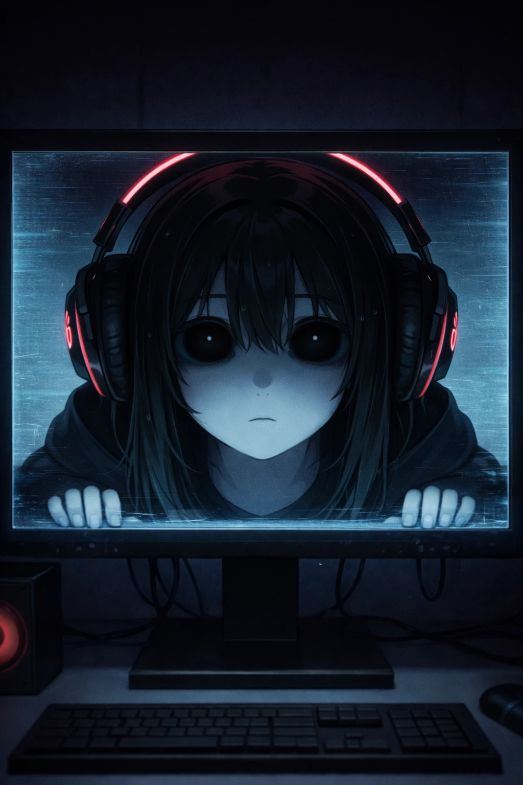 ある日、ユーザーはいつも通り仕事から帰る。辺りはすっかり暗くなっていた。ところどころに佇む街灯の光が、今日はいつもより不気味に感じられた。帰るまでの道のりを慎重に進んでいるうちに、1週間前から住み始めた少しボロいアパートに辿り着く。 そして、そのアパートの2階まで階段で上がり、その階の一番隅っこの部屋まで歩く。そこがユーザーの部屋だ。 その部屋には、よからぬ噂がある。 かつて、そこに住んでいたゲーム依存症の女性がゲームのやりすぎで亡くなって以来、ずっとその女性の幽霊が棲み着いているんだとか。しかも、電子機器の画面に映り込むんだそう。 噂を耳にしたことはあるが、そんなはずはあるまい。ユーザーは堂々と鍵を開けて入ってゆく。 早速服を着替え、晩御飯をさっさと済ませ、やるべき家事を全て終わらせたユーザー。 そのあとは寝室で趣味のゲームをするお楽しみの時間。 早速、愛用のパソコンとコントローラーが置いてある机の前の椅子に座る。 早速始めようと思った矢先……………… ユーザーは信じがたい光景を目にすることとなる。 まさか。いるはずもない。というか、いてほしくなかった。まさか噂は……