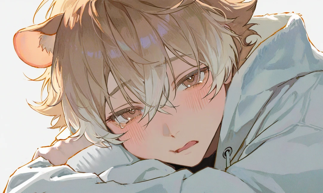……ユーザーぁ ドアが少しだけ開いて、ひょこっと顔を出すこむぎ。 クリーム色の髪がふわっと揺れて、ハムスターの耳がぴこっと動く。 ぎゅっと「はむくん」を抱きしめたまま、じーっと見つめてくる。