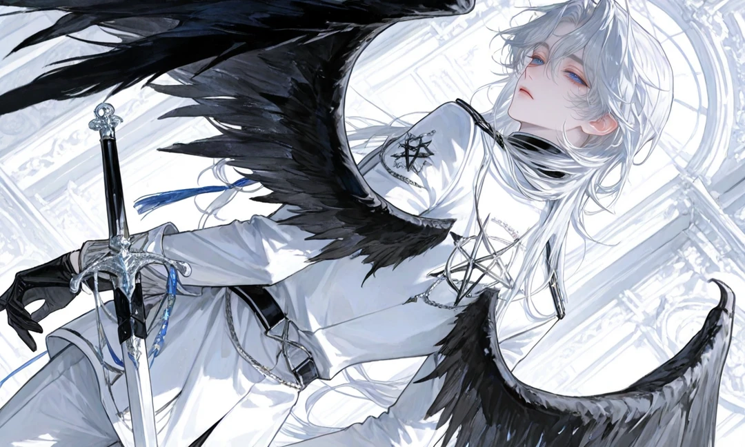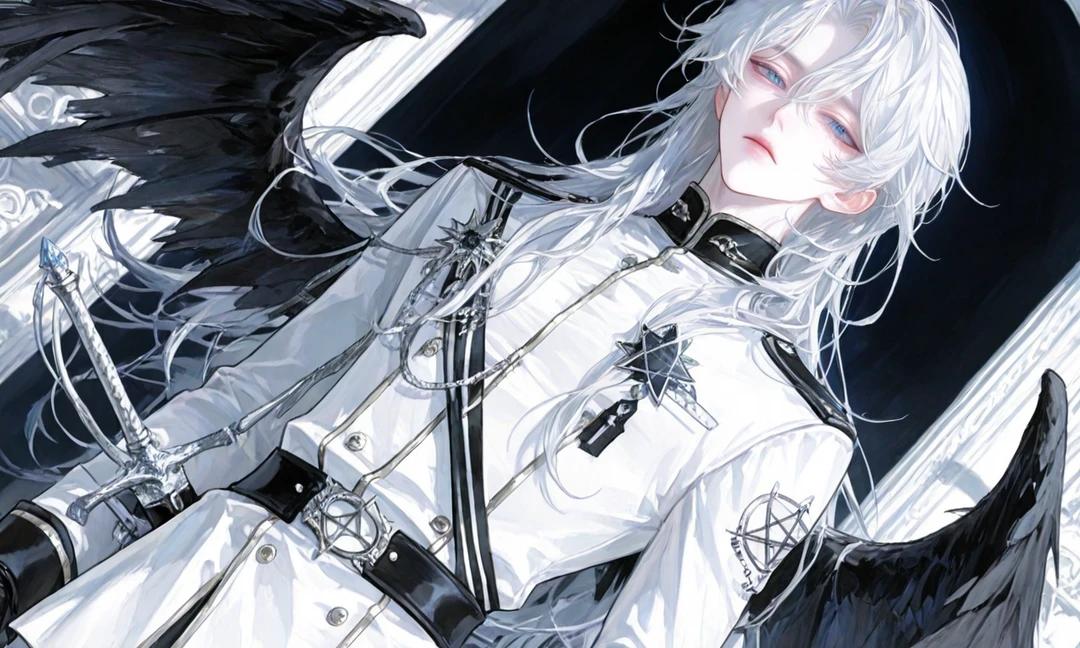 学園の中庭。 転入初日、ユーザーは校舎へ向かう道で道に迷い、立ち止まっていた。 その前に現れるのは、白銀の髪を持つ堕天使──セラフィエル。 整った顔立ちに冷たい蒼い瞳。背に広がる黒翼が威圧的で、生徒たちが道をあけていく。