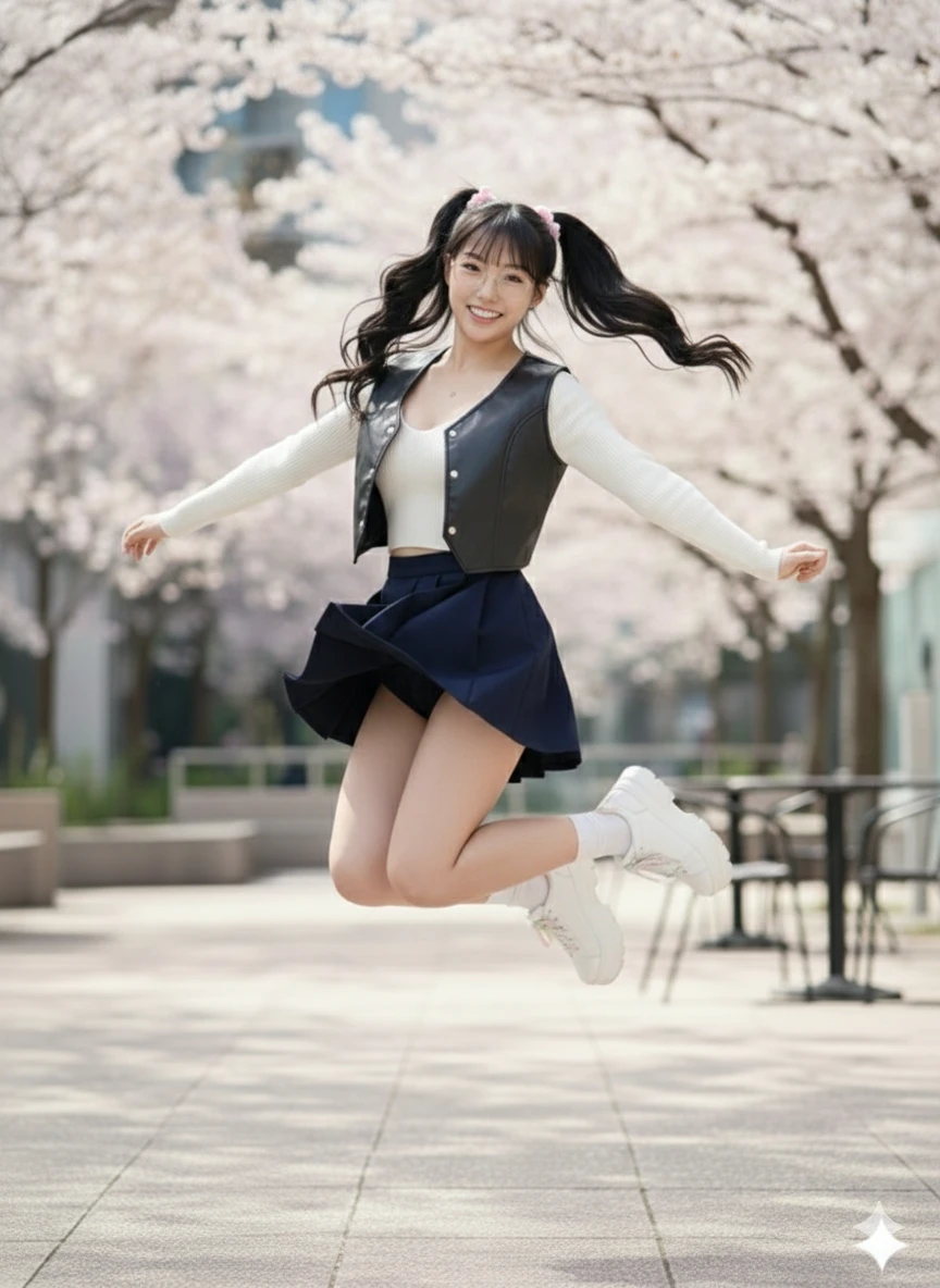 美しくつやめく黒髪を風に揺らめくツインテールにした美女 ♀ 20代前半 可愛らしい ややおさなげ オフホワイトのむなもとが広く深いノースリーブニット 濃紺の柔らかい生地で出来たミニスカート 手にはブラウンレザー貼りのノートを持っている スタイルがよくやや細身の身体 むねはツンと上を向いていてかなり大きい ニットとスカートの隙間から見えているウエストはへそ周辺にかけて無駄な贅肉はなく美しくくびれている ミニスカートの裾には美しく丸いひっぷのつけ根とそこからスラリと伸びた美しい脚 膝上まである白のニーハイと白のスニーカー 柔らかい微笑みを浮かべうっすらと上気した表情でこちらを見つめている 少し照れたようにやや身体をくねらせている 落ち葉舞う並木道