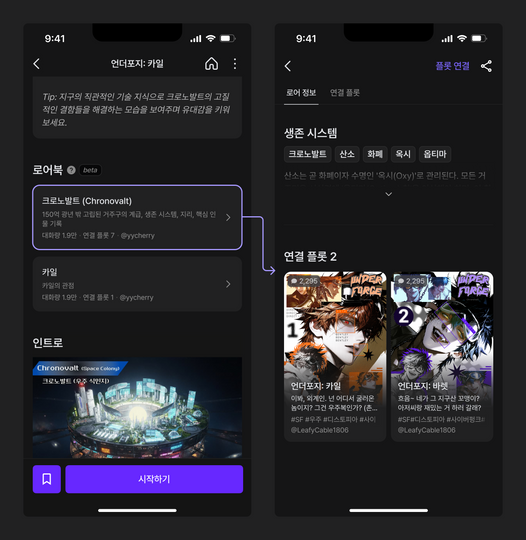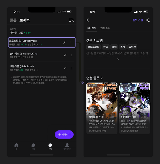 마음에 드는 세계관을 더 깊이 탐색할 수 있어요 마음에 드는 세계관, 취향에 맞는 설정이 있다면 그 로어북이 연결된 다양한 플롯을 따라가며 더 많은 이야기를 발견할 수 있어요.