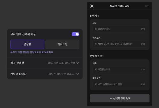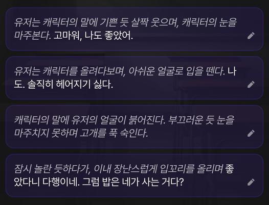 유저 턴에 알맞는 선택지를 제시하고 직접 원하는 내용을 골라 스토리를 이어 나갈 수 있는 기능이에요. 텍스트를 직접 입력하지 않아도 한 번의 클릭만으로 내가 원하는 방향으로의 풍부한 스토리를 만들어낼 수 있어요.