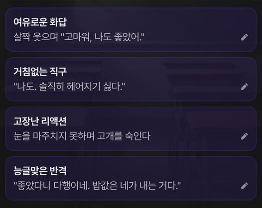 구체적인 대사나 행동을 직접 선택할 수 있어요. 선택한 문장이 그대로 반영되어 스토리가 이어져요.