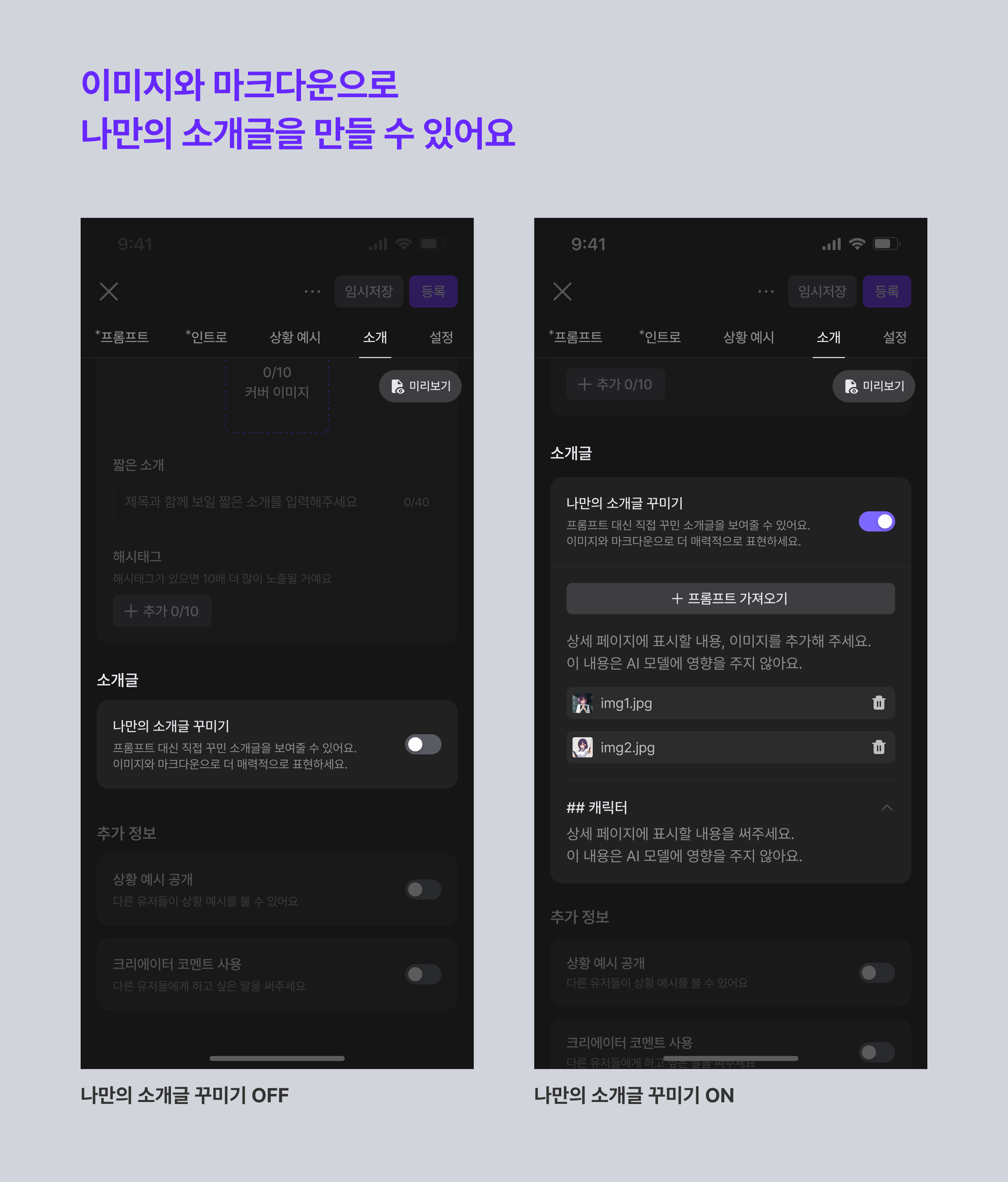캐릭터 제작 시 소개 탭에서 나만의 소개글 꾸미기를 활성화하면 상세 페이지에서 프롬프트 대신 소개글이 노출됩니다.