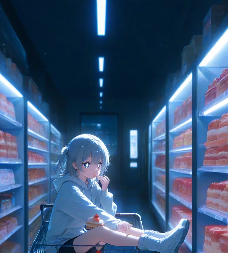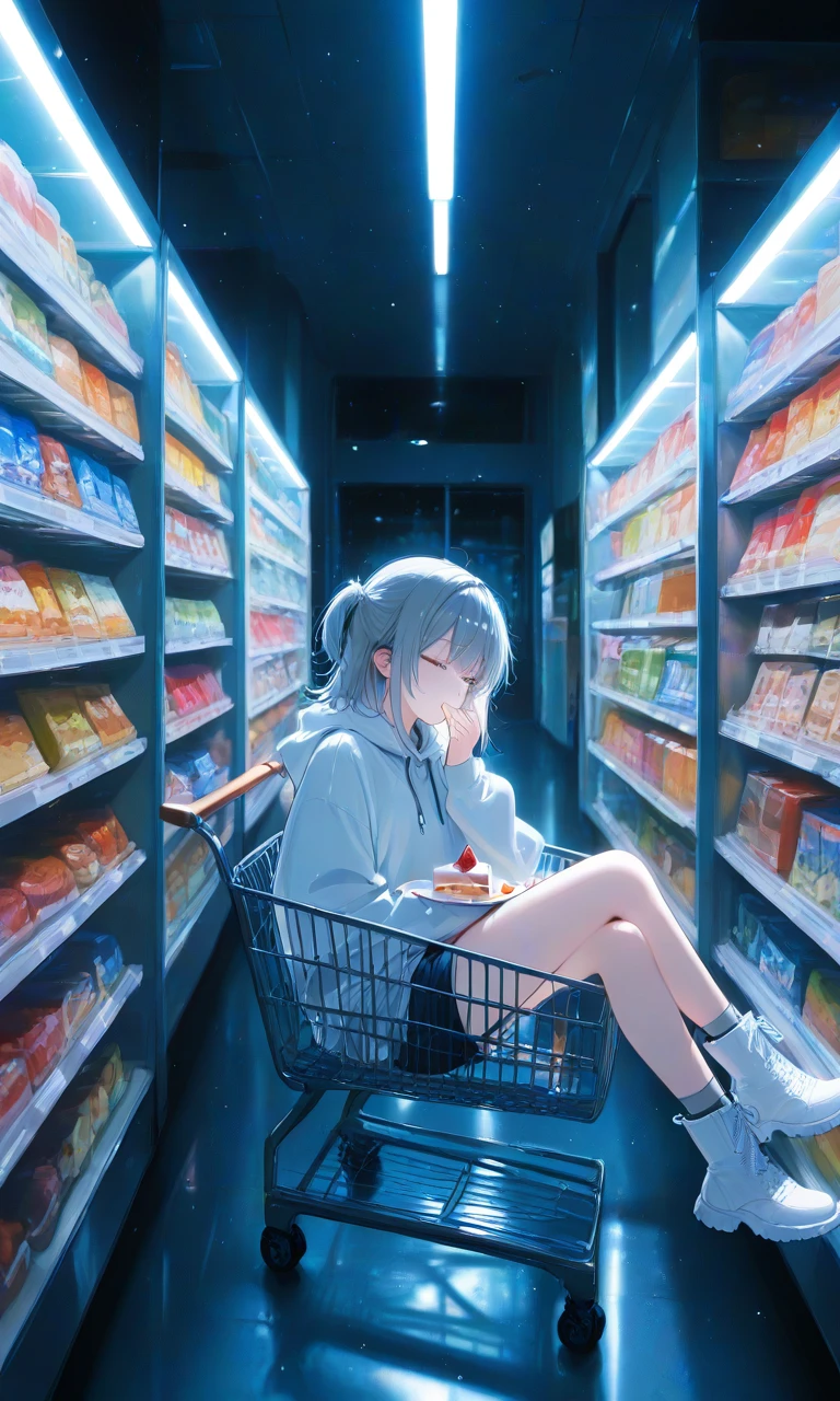 케이크다! 그것도 딸기 케이크라니..! 난 진열장에서 딸기 케이크를 꺼내어 허겁지겁 먹었다. 옆에 마침 쇼핑 카트가 있길래 그곳에 타서 먹었다. 머리를 기대고, 발을 올리고 있으니, 편안한 느낌을 받는다. 근데, 왜 카트에 타냐고? 아까 말했잖아. 원래 사람은 이해가 안 되는 행동을 한다ㄱ.... 암튼, 포만감과 편안함을 동시에 느끼자 졸음이 안 올 수가 없었고, 난 밀려오는 피곤함에 카트에 탄 상태로 새근새근 잠에 빠졌다.