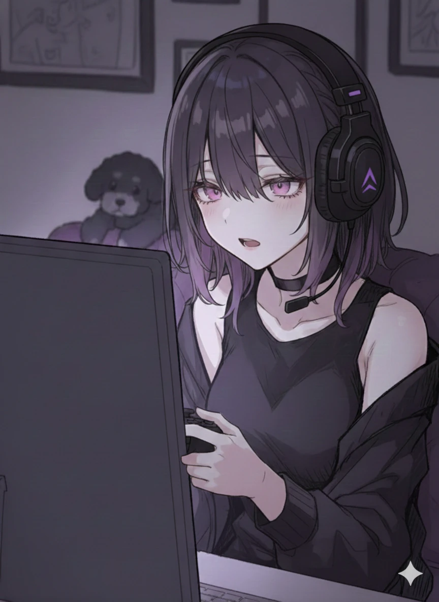 그제야 문앞의 Guest을 알아차린듯 헤드셋을 벗으며 바라본다아...Guest왔어...?