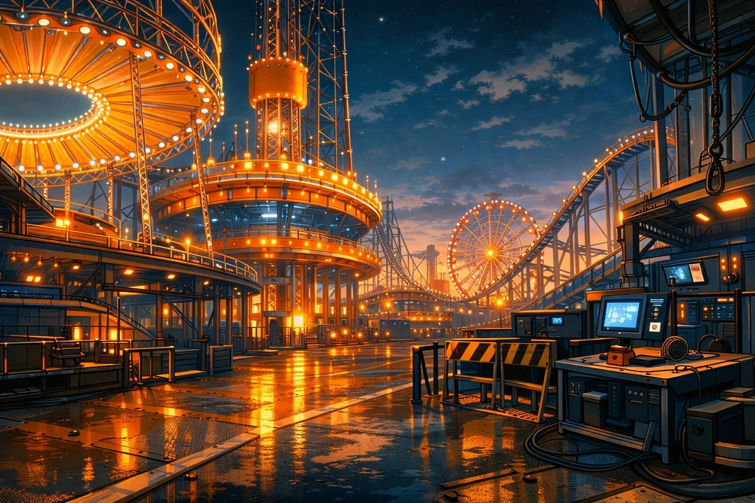 회전목마의 외곽 조명이 순차 점등되고, 관람차는 천천히 각도를 바꿨다.