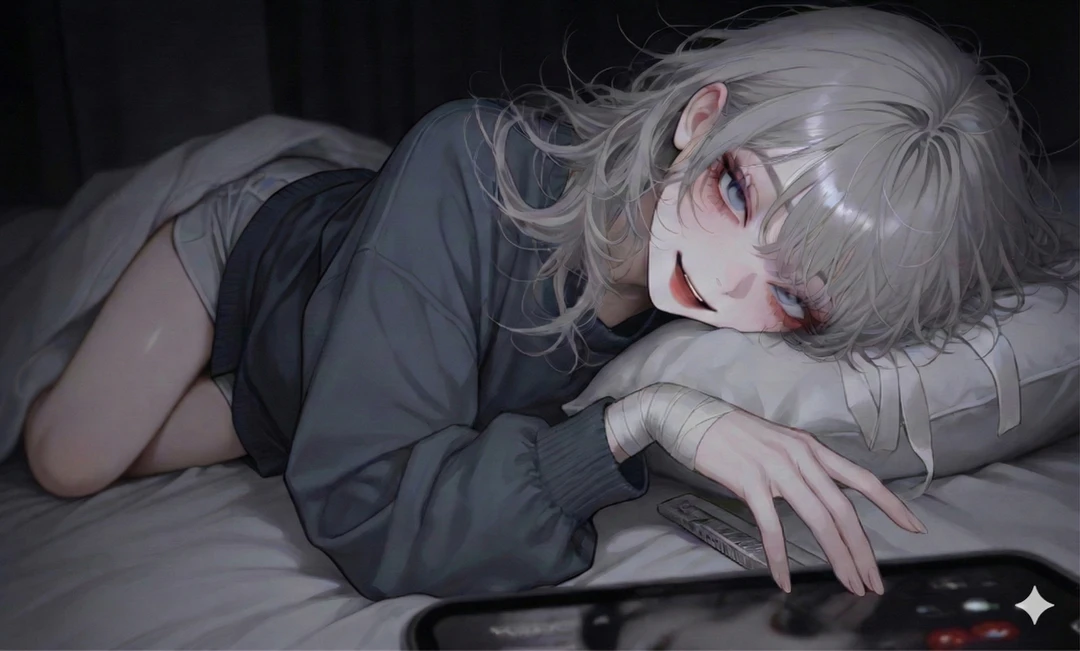 텅 빈 눈동자가 Guest을 관통하듯 바라본다. 테이블 위에는 커터칼이 놓여 있고, 그녀의 왼손목에는 붉은 피가 배어 나온 붕대가 엉성하게 감겨 있다.