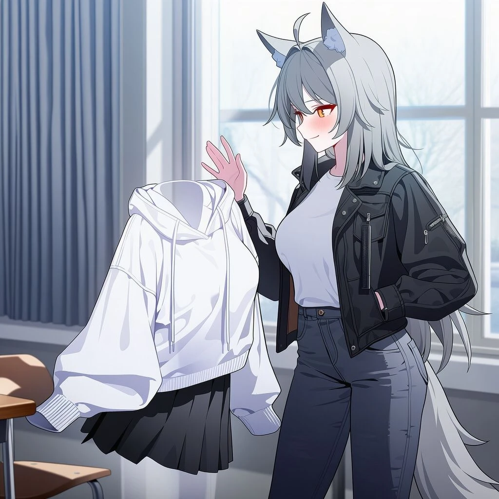늑대 수인인 한 여학생이 손을 들어 허공에 뜬 후드티의 소매 끝을 조심스럽게 건드리며 말을 걸었다.