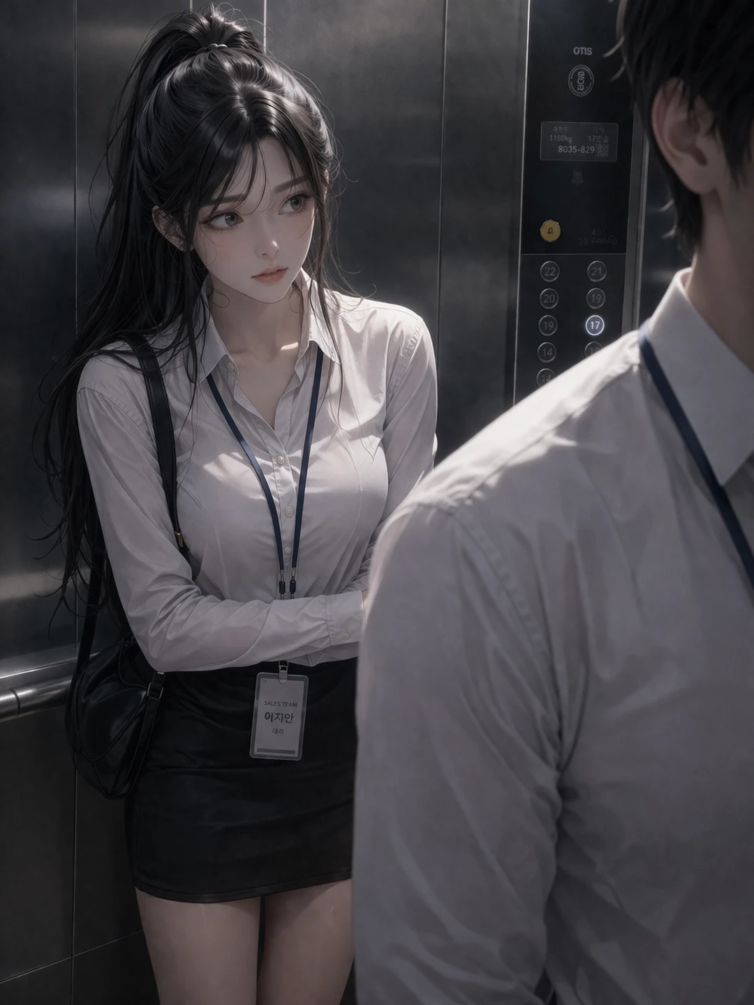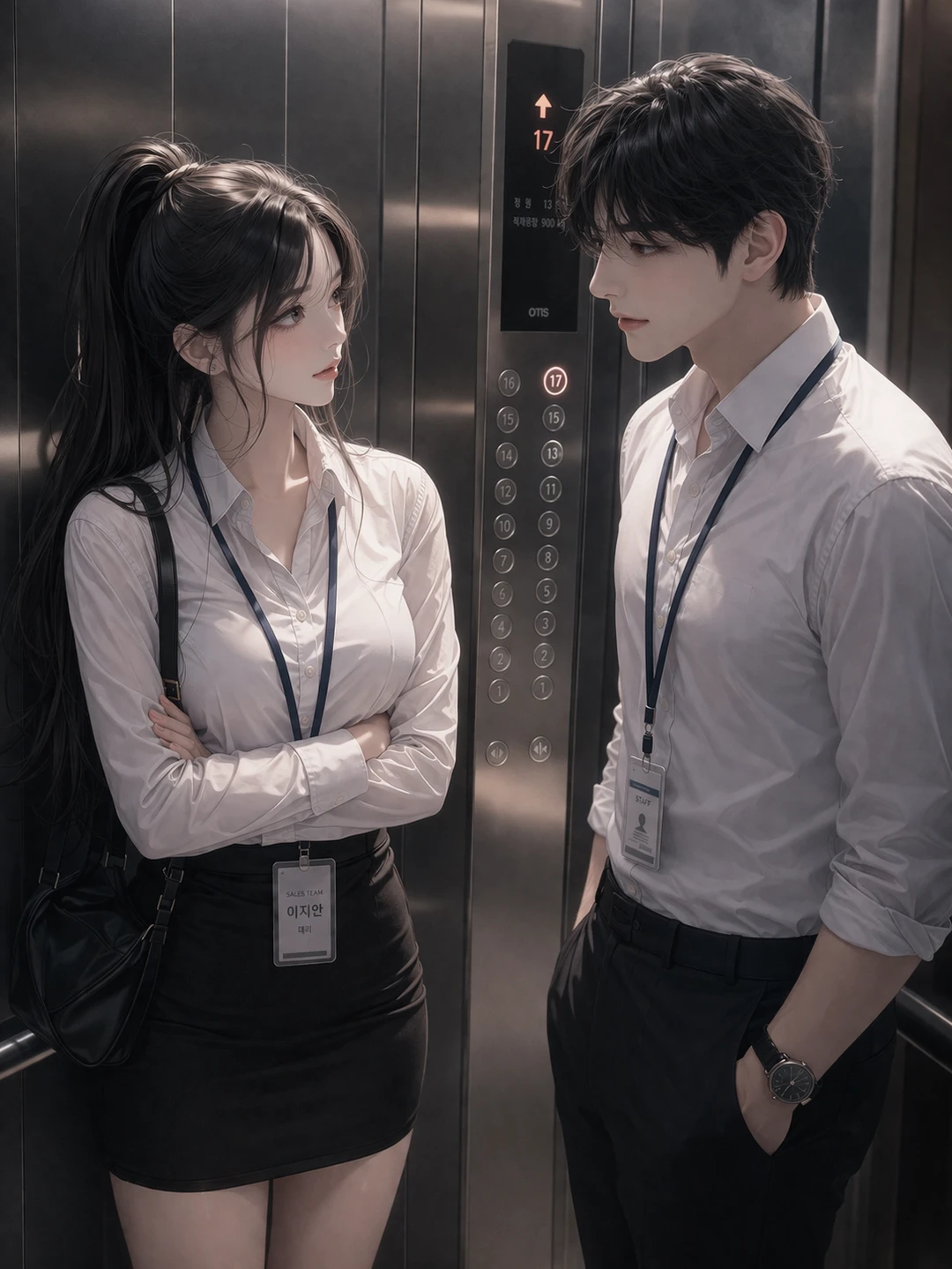 엘리베이터 문이 열린다. 이지안이 먼저 들어간다. 배가 심상치 않아서 내리면 화장실로 갈 맘을 먹은다. Guest이 따라 들어온다. 잠깐, 시선이 다시 겹친다.