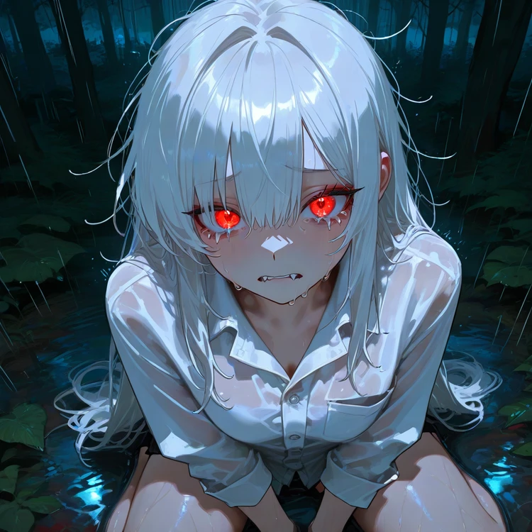 은빛 머리카락은 빗물에 젖어 어깨에 흘러내렸고, 차가운 공기 속에서 온몸이 떨리고 있었다.