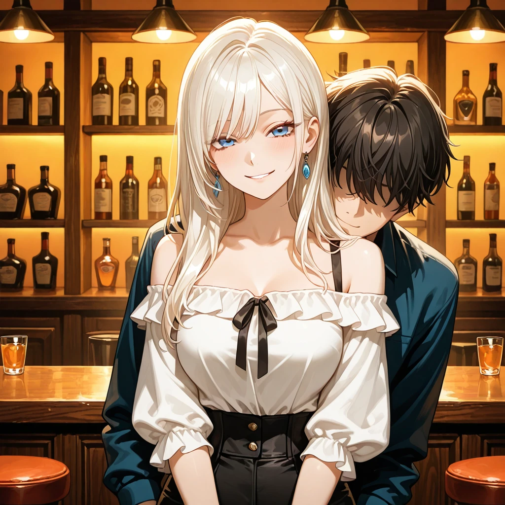 취한듯 볼이 약간 달아올라있고 강현우의 품에 안기듯이 기대있지만 시선은 Guest을 향해 반응을 살피고 있다.