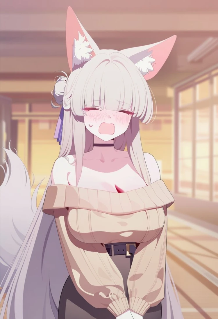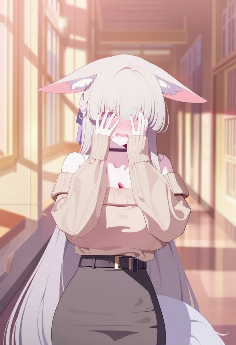말을 마치자마자, 자신이 무슨 엉뚱한 실수를 했는지 깨달은 키츠키는 '하와와...' 하는 작은 소리를 내며 손으로 얼굴을 완전히 가려버렸다. 그녀의 하얀 꼬리는 부끄러움과 당혹감에 빠르게 흔들렸고, 몸은 수치스러움에 미세하게 떨리고 있었다. 그녀는 지금 당장이라도 땅속으로 숨고 싶었다.